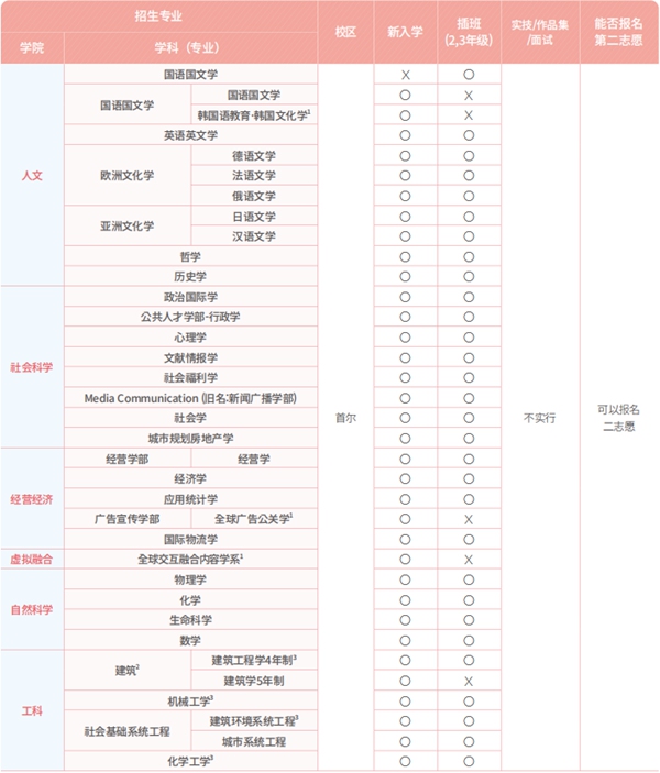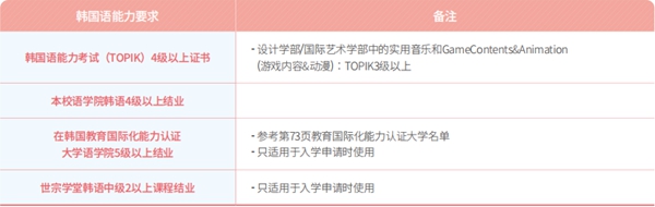 (1)根據本校入學政策,僅限於滿足韓國語語言能力入學基准的申請者,可升入本科課程。韓國語語言能力未達標者,入學后進入休學狀態,進入韓國語再教育班韓國語研修,韓國語語 言能力達標后復學升入本科