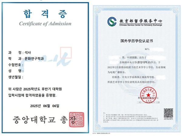 韓國中央大學錄取通知書及中留服國外學歷學位認証書樣本