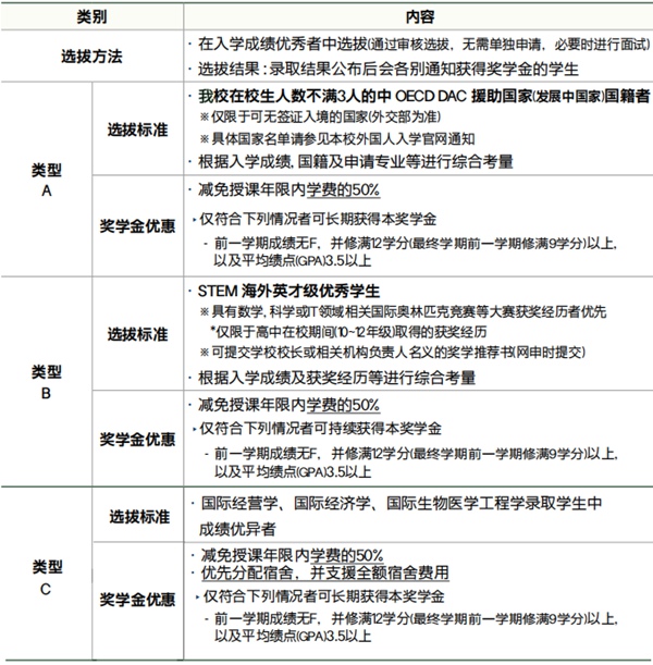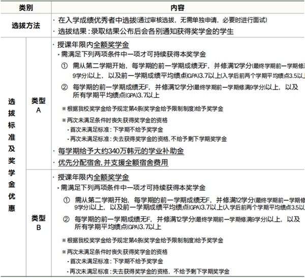 注:若錄取學生在支付學費后至第一學期開學前滿足上述韓語能力后補交語言成績時,亦可獲得相應獎學金