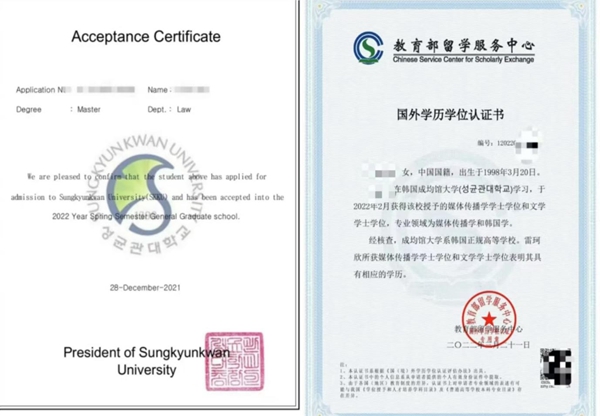 韓國成均館大學錄取通知書及中留服國外學歷學位認証書樣本