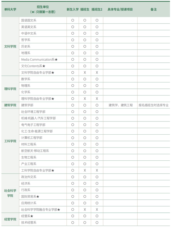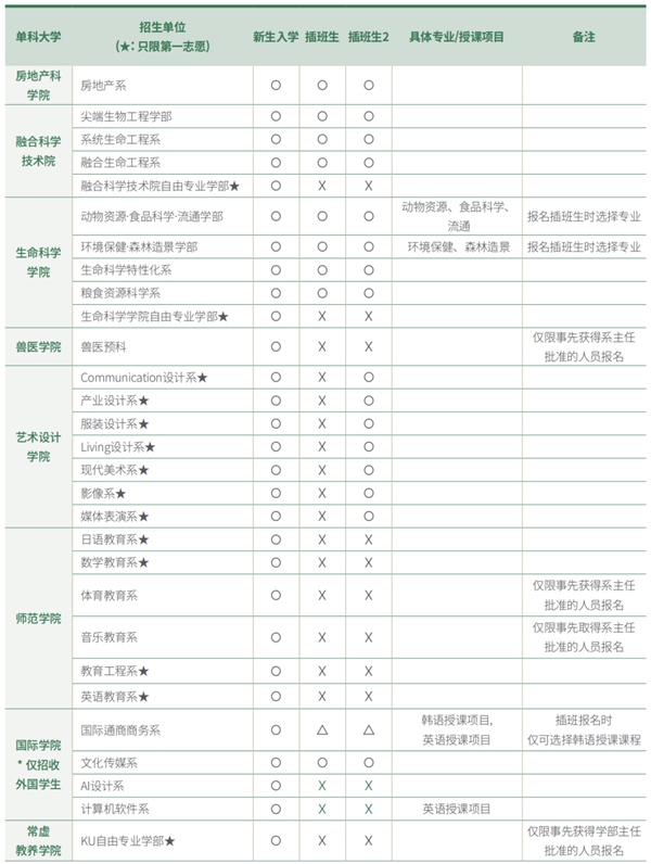 ▷ KU自由專業學部(無專業)不可選擇的招生單位: