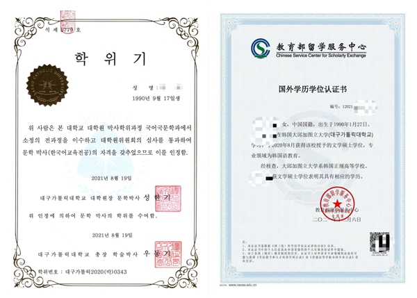 大邱加圖立大學學位証及中留服國外學歷學位認証書樣本