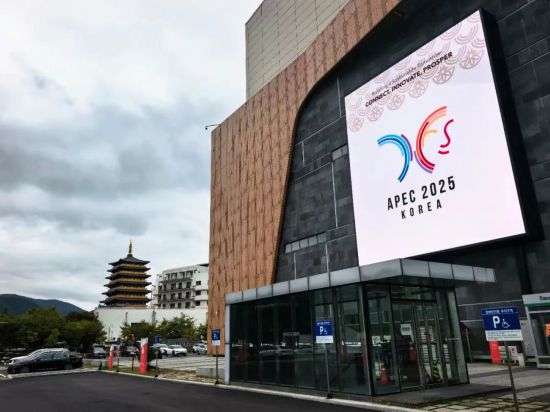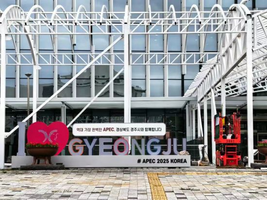 由於尚在施工,慶州和白國際會議中心並沒有向《環球時報》記者展現自己最終的樣貌,目前可以看到的情況是,會場主體建筑規模很大,外立面更多是玻璃結構,會場側面的牆體上有巨大的顯示屏,穿插播放著兩款分別以藍色和白色為底色的APEC會議宣傳海報。會場正門有一塊迎賓標識,上面除了寫著“GYEONGJU APEC 2025 KOREA”,還有一句韓文,大意是“最完美的APEC會議,與慶尚北道慶州市共襄盛舉”。