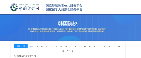 韓國江南大學中國留學網認証院校查詢頁面截圖