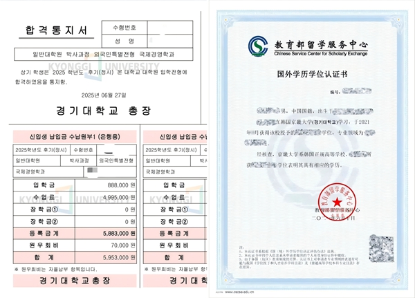 京畿大學錄取通知書及中留服國外學歷學位認証書樣本