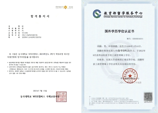 韓國東國大學錄取通知及中留服國外學歷學位認証書樣本