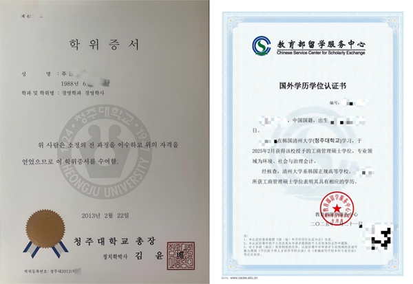 清州大學學位証及中留服國外學歷學位認証書樣本