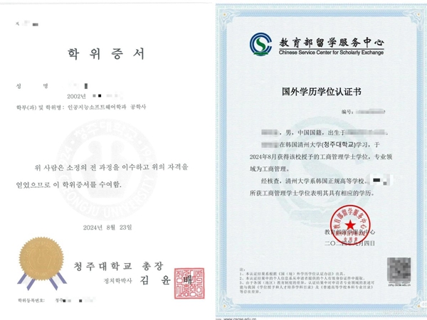 清州大學學位証書及中留服國外學歷學位認証書樣本