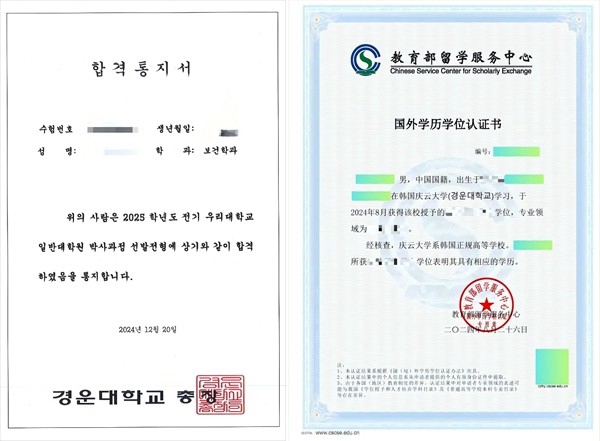 韓國慶雲大學錄取通知及中留服國外學歷學位認証書樣本