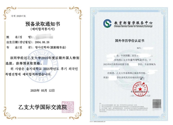 乙支大學預錄取通知及中留服國外學歷學位認証書樣本