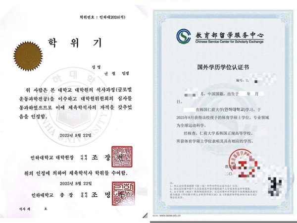 仁荷大學學位証書及中留服國外學歷學位認証書樣本