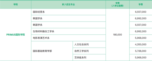 ※ 報名申請國際基礎教育學部的學生, 第一學年適用於學部內系列(人文社會、自然工學、藝體能)的學費標准﹔自第二學年起, 適用進入所屬專業的學費標准(進入大二專業后學費可能有所變動)