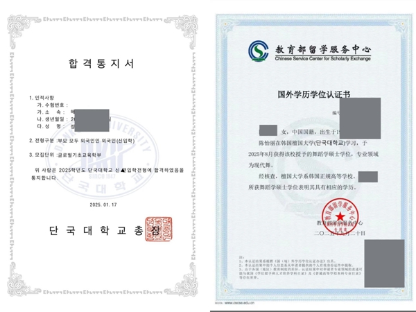 檀國大學錄取通知書及中留服國外學歷學位認証書樣本