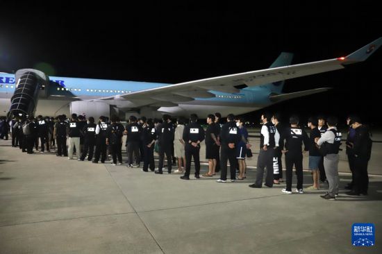 10月18日凌晨,在柬埔寨金边德崇国际机场,警察押送被遣返的韩国网络诈骗嫌疑人登机。新华社/柬新社