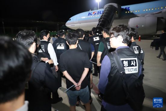 这是10月18日凌晨在柬埔寨金边德崇国际机场拍摄的被遣返的韩国网络诈骗嫌疑人。新华社/柬新社