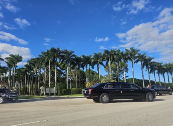 当地时间10月18日,在佛罗里达州特朗普国际高尔夫俱乐部一带,疑似软银CEO孙正义乘坐的黑色豪华巴士驶向棕榈滩。图源:韩媒