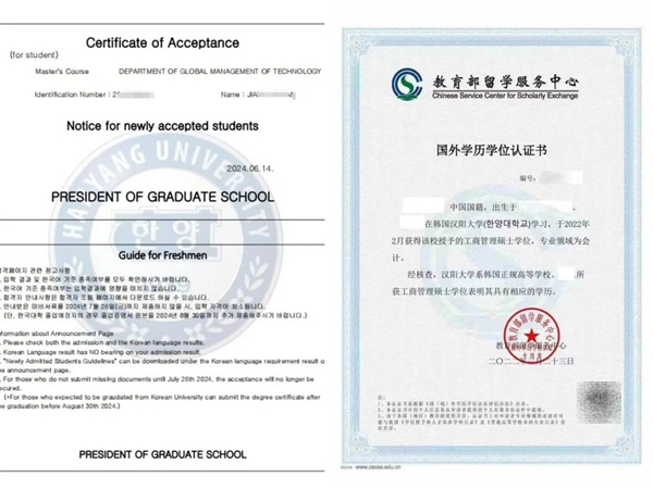 汉阳大学录取通知书及中留服国外学历学位认证书样本