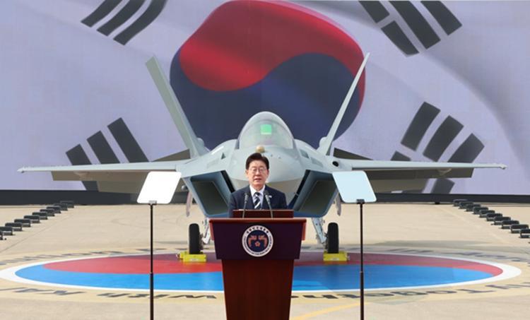 当地时间3月25日,韩国总统李在明在庆尚南道泗川市韩国航空航天工业公司举行的KF-21“猎鹰”首架量产机出厂仪式上致辞。 图源:韩媒《韩国经济新闻》